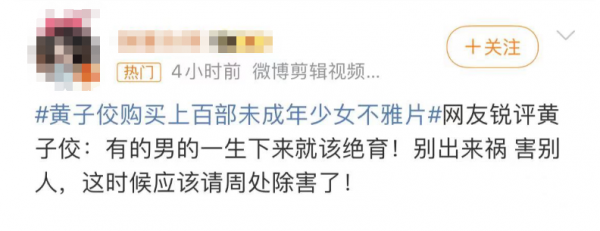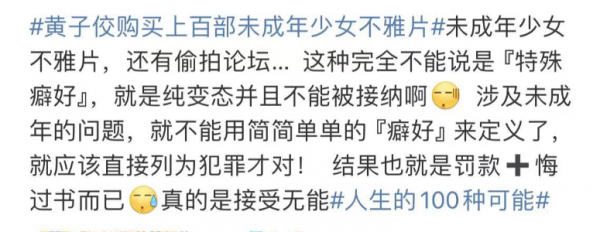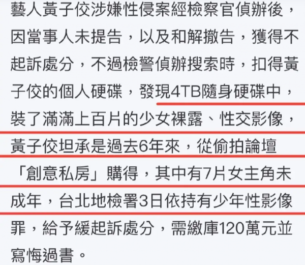 黄子佼加入偷偷拍摄隐私照论坛,购买上百部未成年少女的不雅片这件事,已经是非常令人不适的一件事情了。这样毫无正能量的艺人,大部分网友的一件都是永久封杀的了。