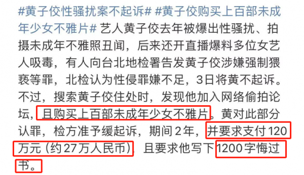 对于这一行为,黄子佼被罚款120万元台币,大约是27万元人民币,并且被要求写下1200字的悔过书。