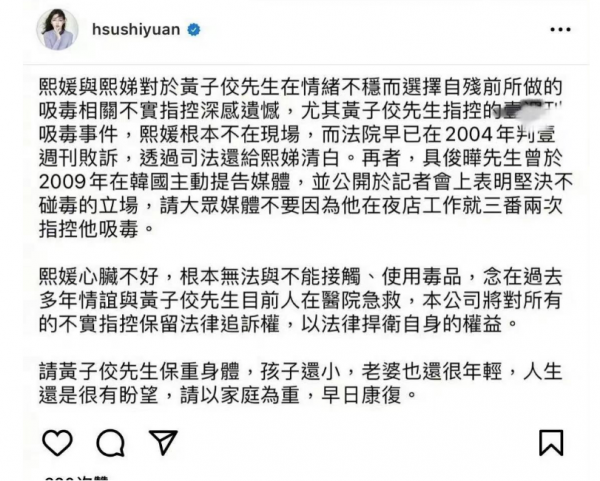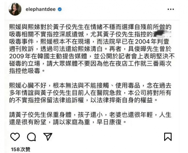 但希望黄子佼先生不要再继续散播不实言论,诋毁大S和具俊晔,否则会用法律捍卫自己的权益。