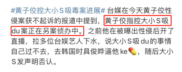 黄子佼在侵犯女生一案中受到了应有的惩罚,在某些方面与受害者也达成了共识。可在指控大小S嗑药的案件中,台媒表示目前进度还在侦查。