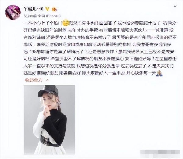 一直到了2017年,王金龙在一场直播中透露了两人早已离婚的事情。丫蛋见此,也出来回应了这件事,称两人已经分开了四年,只是在去年才办了手续。
