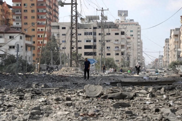 10月10日,在加沙城,人们走过被以色列空袭炸毁的建筑废墟。图片来源:新华社