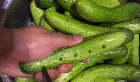 第一步:准备市场上买来的这种顶花带刺的短粗小黄瓜,先一个个的用清水给它清洗干净,然后控干水分,准备一根筷子,给它周身都戳上小洞,如下图所示即可。