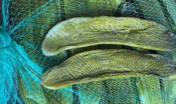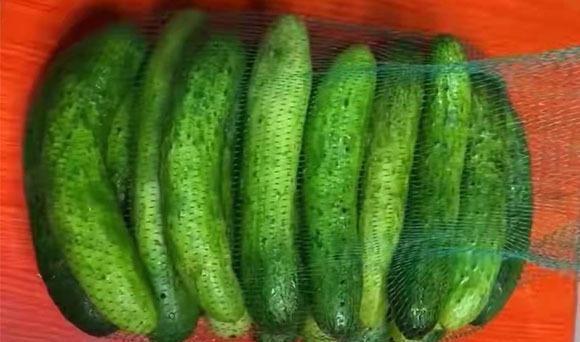 第三步:准备一个大点的网袋子,清洗干净,将烫过的黄瓜,依次挨个的装入网袋子中,然后收口处给它打上死结,一定要给它收好口,系紧一些。
