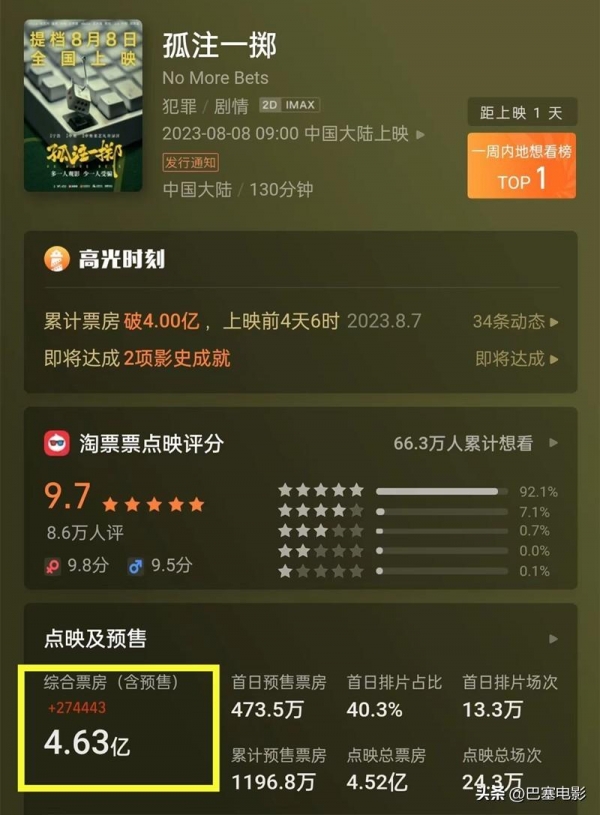 首日点映斩获1.75亿票房,次日点映便获得2.18亿,连续突破暑期档和影史单日点映票房最高纪录。截至目前,总票房已突破4.6亿。而购票平台的开分,也高达9.7。