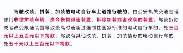 这种看似是为车主所考虑的做法,但实际上是把电动车人为的推进"违规车型"范畴,这类车属于超标车,同样是不允许在道路行驶的,违规上路被处罚,会被交警查处。