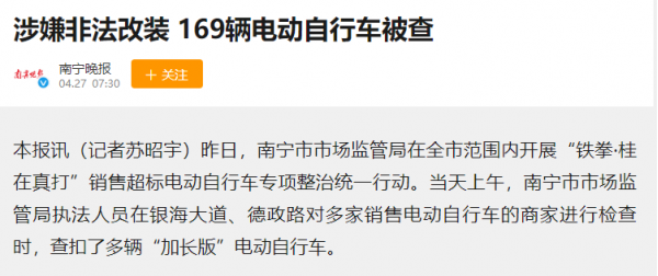 商家热衷于改变电动车的外观,而各地市场监管部门也会重点查处这一行为,在4月底,南京就对多家电动自行车商家进行检查时,有169辆电动车被查,涉嫌非法改装,而主要问题是"加长版"。