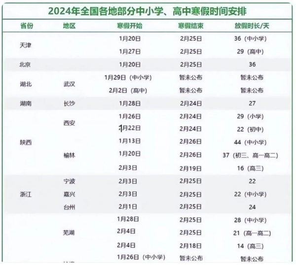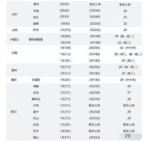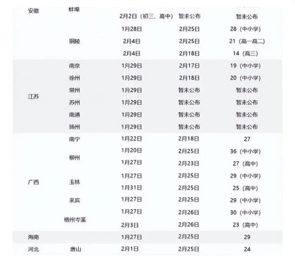 今年中小学放寒假的时间已经出炉了,全国多地公布了放寒假的时间,我们先睹为快,还有一些省份地区没有公布出来,大家耐心等待。