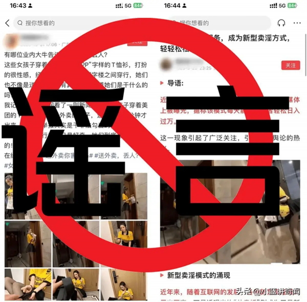 部分自媒体通过将女性身着外卖工服、丝袜或短裙送外卖的擦边视频及照片拼凑在一起,这些视频和照片也成为网上数千条涉性谣言的素材,在网上流传,被大量自媒体解读为"新型卖淫模式"。