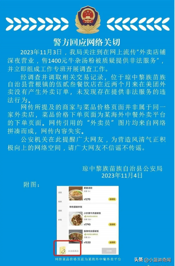 海南琼中警方在接到报警后,立即火速出击介入调查。经调查,警方发布通报称"外卖1400元牛杂汤提供非法服务"为不实信息。同时,另外三名被起诉的网红分别是"萌妹御姐控"、"苏苏在送餐""宝儿琪琪格",其中"宝儿琪琪格"在今年8月因拍摄"女骑手深夜被盗车后大哭"引发公众关注,后被湖南怀化警方介入调查,以涉嫌编造发布虚假信息扰乱公共秩序对其行政拘留