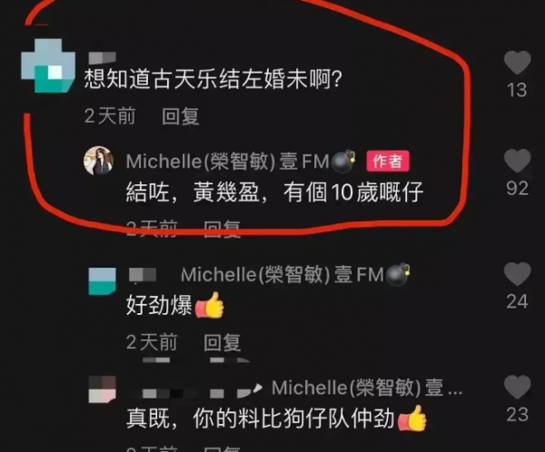 有网友在香港娱记荣智敏的短视频账号下留言询问古天乐的感情状况,好奇51岁还在拼事业的古仔有没有找到另一半呢?