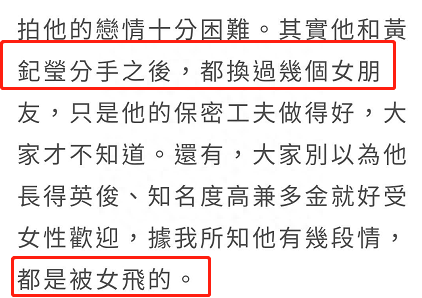 娱记白露眉曾爆料,称古天乐跟黄纪莹分手后换过好几任女友,只是大家都不知道,而且他还被甩了好几次。