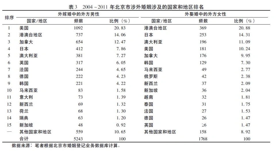 论文提到,2004年-2011年北京市涉外婚姻中外国男女分别是5243和1768例,大约是3:1。