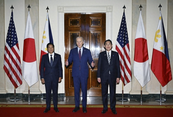 当地时间4月11日,马科斯、拜登和岸田文雄在华盛顿举行会谈