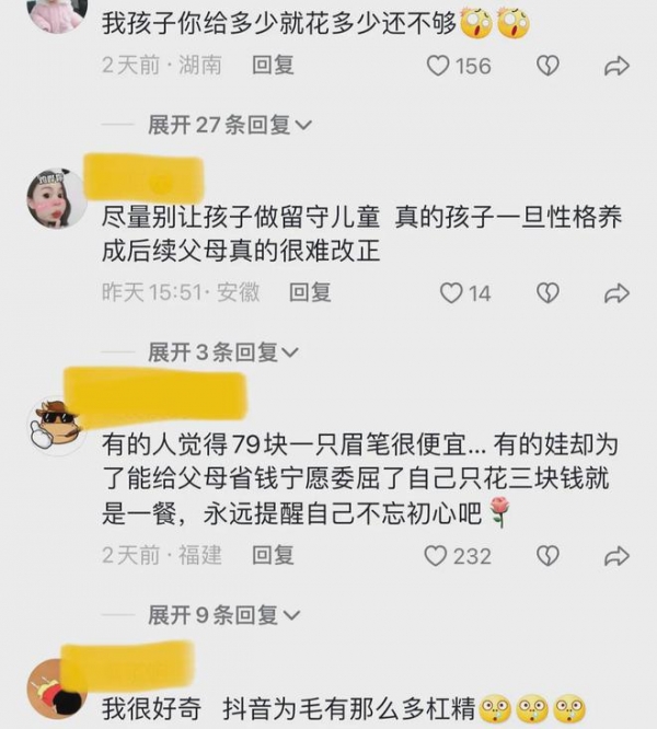 甚至还有网友说,尽量不要让孩子做留守儿童。孩子的性格一旦形成了就很难改了,父母赚再多钱,养出来的孩子自卑,懦弱,没有格局,有什么用呢?