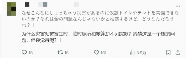 一名网友发表了这样的评论:"中国的灾难面前,我们看到的是紧密合作和坚定意志。他们的速度和行动力真是让人钦佩。而日本呢?他们在一次又一次的灾难中,却始终没有学到任何教训。"