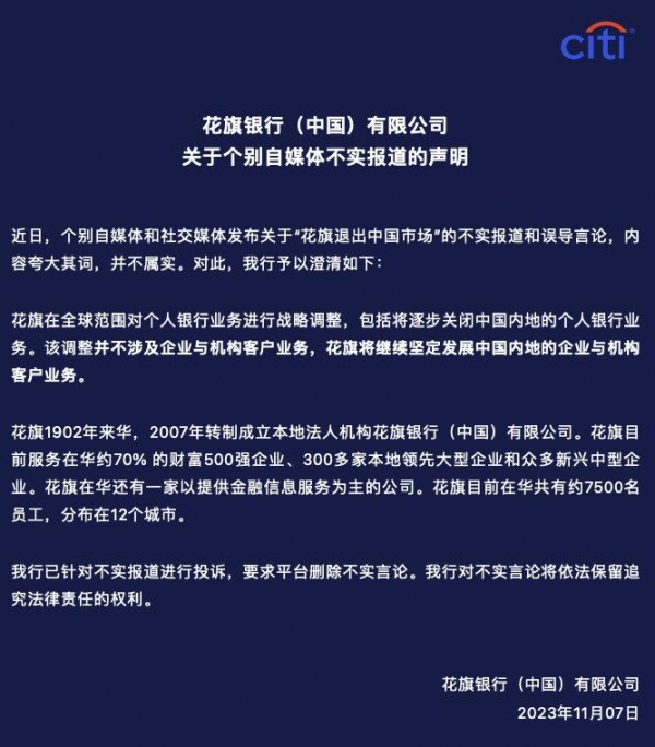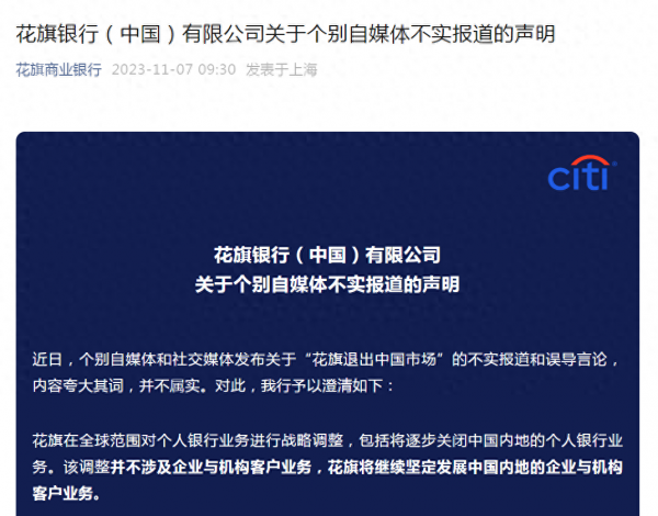 11月7日,花旗银行(中国)有限公司发布声明称,近日,个别自媒体和社交媒体发布关于"花旗退出中国市场"的不实报道和误导言论,内容夸大其词,并不属实。花旗在声明中称,花旗在全球范围对个人银行业务进行战略调整,包括将逐步关闭中国内地的个人银行业务。该调整并不涉及企业与机构客户业务,花旗将继续坚定发展中国内地的企业与机构客户业务。