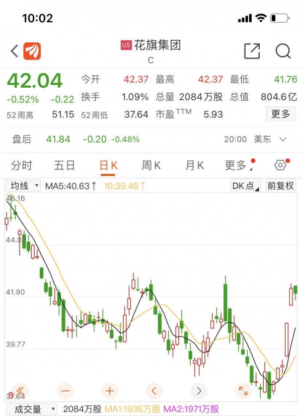 截至美股收盘,花旗集团(C)跌0.52%,暂报42.04美元,最新市值804.6亿美元(约合人民币5853亿元)。