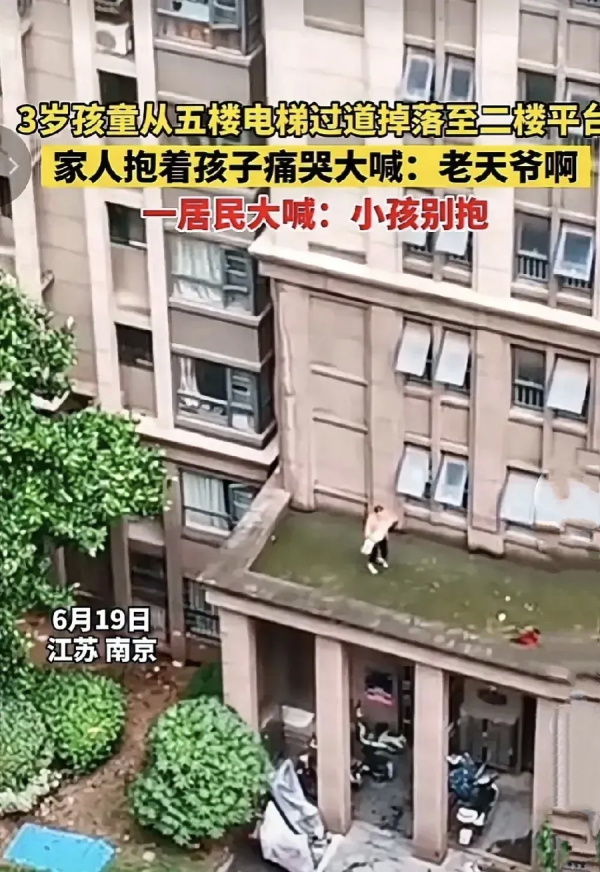 6月19日,江苏南京。一名只有3岁的儿童从五楼电梯过道掉落的二楼平台上,让人看着十分的揪心。