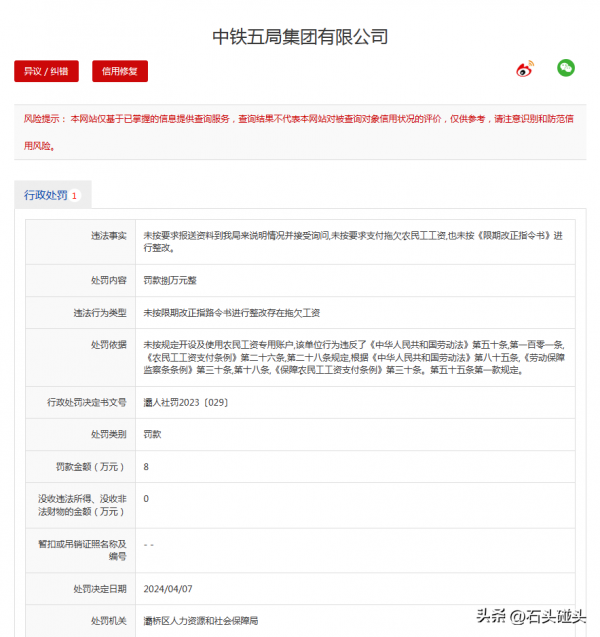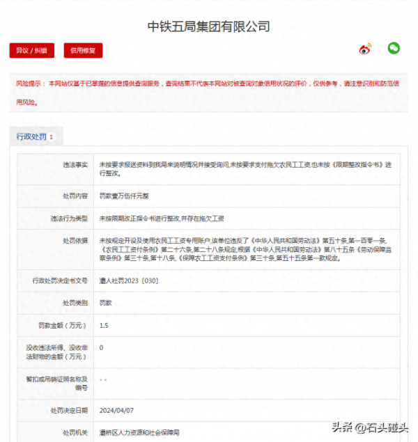 近日,关于中铁五局因为拖欠农民工工资被罚的事情冲上热搜。