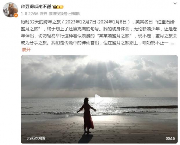 2023年年底,"喵爷爷"带着"喵奶奶"开始了为期32天的"红宝石婚蜜月之旅",在网上晒出甜蜜的照片。粉丝在微博上跟随谢谦笔下的山南水北,不经意地又被撒了一把"狗粮"。