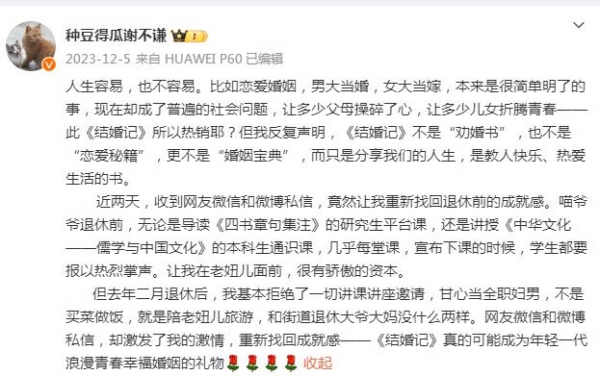 线上"秀恩爱",线下却有来自"喵奶奶"的声讨。谢谦习惯把生活中的日常琐事挪运在微博,钱一鸣则埋怨:"发点儿好的可以,吵架的这些内容就不需要发啦!""喵爷爷"不解:"文学不能只报喜不报忧,这样就失真了嘛!我就是要记录生活的细枝末节!"