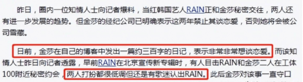 但是很快金莎就破了毕晓世为其定下的规矩,竟然与当时在韩国正当红的歌手RAIN传起了绯闻。据悉两人在一次活动上相识,之后RAIN来北京宣传新专辑时,金莎还与他在工体约会。虽然当时两人打扮都非常低调,但还是被歌迷认了出来。