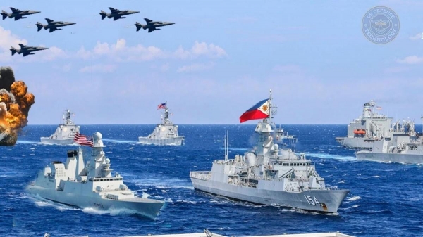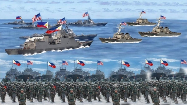 目前,美国宣布和菲律宾一起在南海联合巡航,菲律宾出动多艘舰艇飞机参与。联合军演之前,菲律宾军方说,菲律宾有权与盟国进行联合巡逻,以推动"基于规则的国际秩序"。