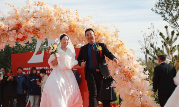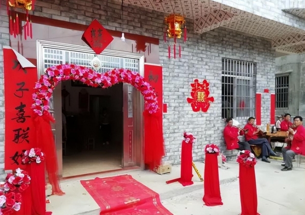 婚礼当日,李某的家全都贴上了喜气洋洋的红色喜字、花牌和彩球。村里的亲朋好友们也都前来捧场,乐队奏着热闹的音乐。李某身着新做的红色喜服,有些拘谨地站在门口迎宾。