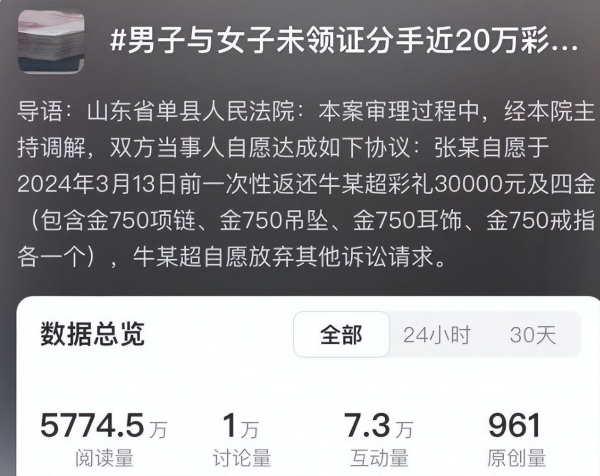 4月9日,据观察网报:一对男女谈了三年的恋爱,期间女子张某长期不在家,仅仅同居十天,男方牛某超却大方地送出了将近20万的彩礼以及"四金"。最后俩人也没有领证结婚,最终选择了分手。这就尴尬了,因为分手后,那笔彩礼怎么处理成了个大问题。男方想要回彩礼,毕竟20万不是个小数目。结果,事情最后进了法院,经过调解,女方却只退还了3万彩礼。