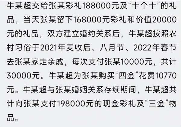 看起来是准备好开始新生活了,对吧?但事情没那么简单。结婚后,男的给了彩礼188000及"十个十"礼品,前前后后去女方家走亲访友每次支付10000元,三年共计30000元,男方也买了"四金"花费了10770元,原本是很正常的幸福家庭生活。