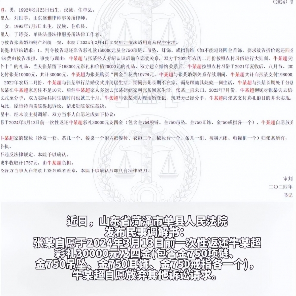 一、张某自愿于2024年3月13日前一次性返还牛某超彩礼30000元及四金(包含金750项链、金750吊坠、金750耳饰、金750戒指各一个),牛某超自愿放弃其他诉讼请求;