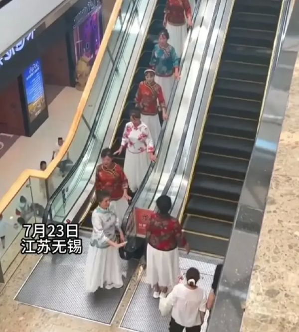 近日,江苏无锡,一位网友曝料某商场自动电梯上,有多位穿着汉服的大妈霸占商场扶梯拍视频,有乘客要过来乘坐电梯,大妈就伸手阻拦其他顾客乘梯,要求等先拍完。