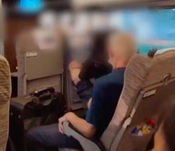 视频中,列车上一男子向后调整座位,被斜后方的老人狠狠一脚踢了回去,老人身旁的女性赶忙起身让老人把脚放下来。