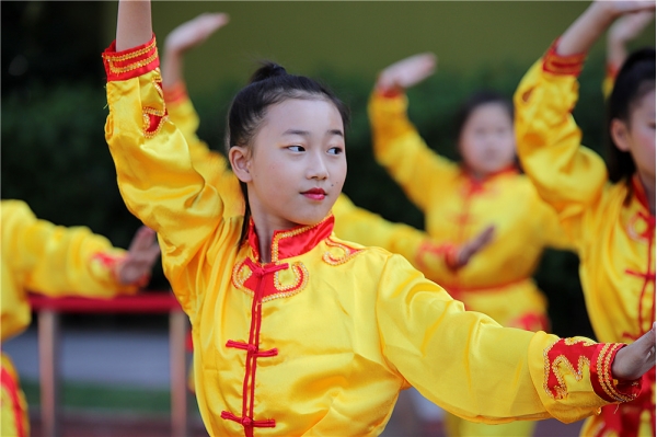 近日,江苏盐城。一名小女孩放学后在校门口练拳热身,动作行云流水,步伐稳固,出拳带风。