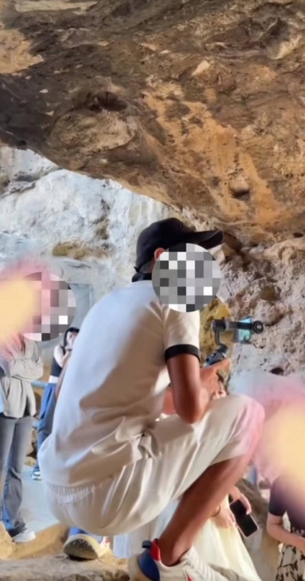 删除完毕后,赵晓和周颖到不远的另一处拍照点排队等待。等待期间,该男子一直绕着镜山顶,边走边拍,又站到台阶处从上往下拍,不久后又蹲到一块石头上拍摄。