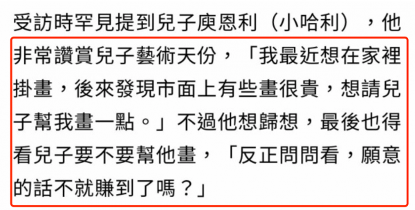庾澄庆曾给说想在家里挂画,但觉得市面上的画卖得比较贵,所以想让孩子帮自己画一张,不过他也很尊重儿子的想法,如果他同意的话,那么自己就赚到了。