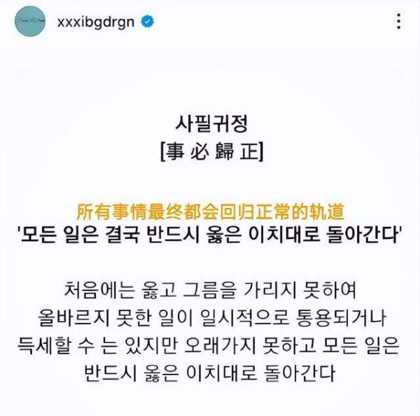 更有意思的是,权志龙前脚刚离开警局,随后就立刻上线发文,而且他特意配上四个汉字:事必归正。同时他还用韩文解释道:所有的事情都会回归正常轨道。看上去丝毫不受影响的样子,估计他是想趁着初检"阴性"的热度,来借此证明他的清白。