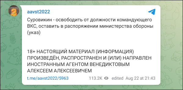 当地时间8月22日,"莫斯科回声"广播电台前主编阿列克谢·维内迪克托夫在Telegram上发文称,俄特别军事行动副总指挥苏罗维金已被解除俄罗斯航空航天军司令的职务。
