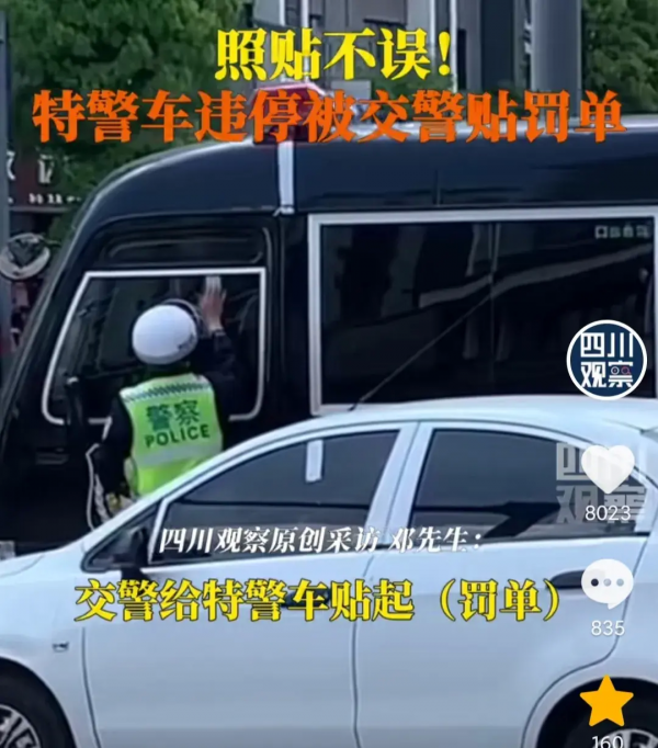 特警车违停被交警贴罚单!网友炸锅了