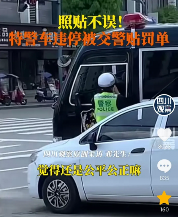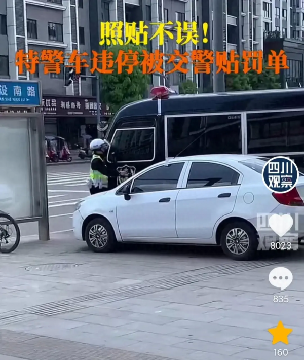 四川南充,交警在街上巡逻,发现一辆特警车辆违停,没有丝毫犹豫上前就给贴了一张罚单。