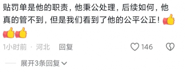 也有网友表示,看到的是交警的秉公执法,后续如何交警是管不到的,贴罚单是交警的职责。