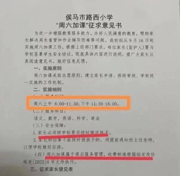 侯马市路西小学学生家长向记者提供的"侯马市路西小学'周六加课'征求意见书"显示,加课采取自愿原则,服务科目是语文、数学、英语、科学、道法。上课时间为上午8点到11点半,下午2点半到6点。加课属于课后服务管理,收费标准根据临发改价格发[2022]8号文件执行。