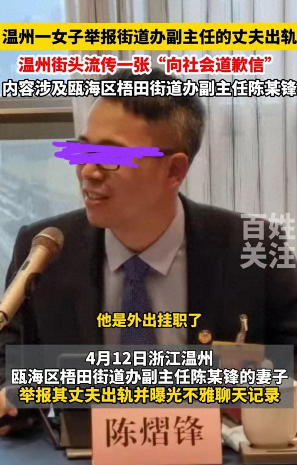 4月12日,温州一女子举报自己街道办副主任丈夫出轨,并且曝光了相关的聊天记录。