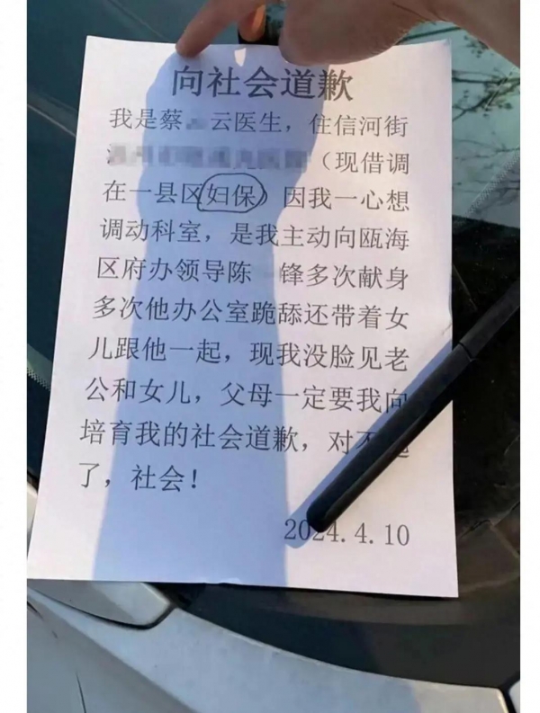 唉,那份"向社会道歉"的信上面这么写的:"大家好,我是蔡云云,一个医生。我工作地点在信河街的温州市眼视光医院,最近被调到一个县区的妇幼保健院工作。因为我挺想换个科室,就主动接近了甄海区府办的领导陈某峰,多次做出了不该做的事,甚至有时候还带上了我女儿...现在我真的丢不起这个人,面对不了我的老婆和女儿,我爸妈也坚持让我向培养我的社会公开道歉,真的很对不起!"