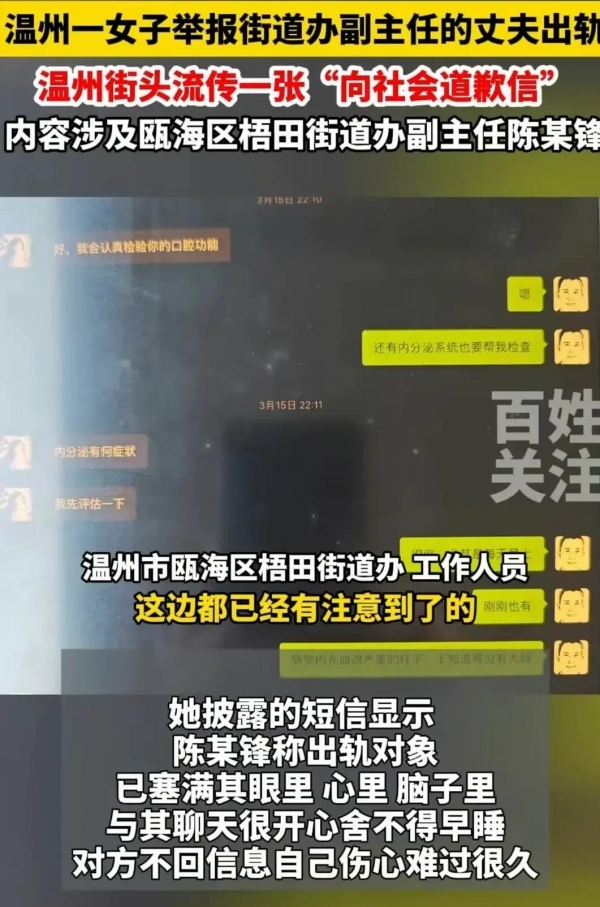 按照爆料女子的说法,自己的丈夫,也就是温州瓯海区梧田街道办副主任陈某,存在婚内出轨行为。