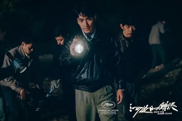 马哲穿着的八十年代的皮夹克,拿着手电筒追查案件。