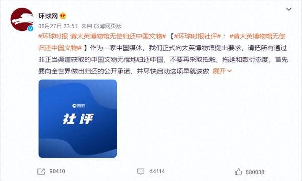 8月27日,《环球时报》社评:作为一家中国媒体,我们正式向大英博物馆提出要求,请把所有通过非正当渠道获取的中国文物无偿地归还中国,不要再采取抵触、拖延和敷衍态度,首先要向全世界做出归还的公开承诺,并尽快启动这项早就该做的工作。