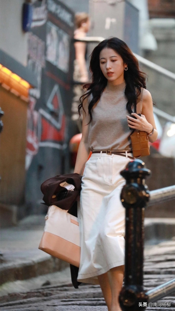 周雨彤在《半熟男女》路透中的服装,是标准的职场穿搭,她身上的优雅气质,让人感觉像是真的上过班。