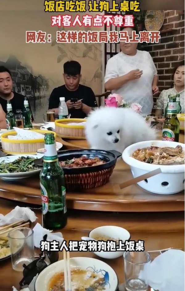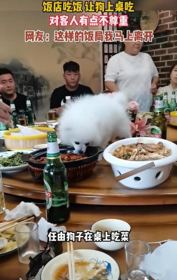 这时,狗主人趁大家还没有动筷子,直接把狗放在了餐桌上,任由狗狗在桌上享用丰富的宴席。